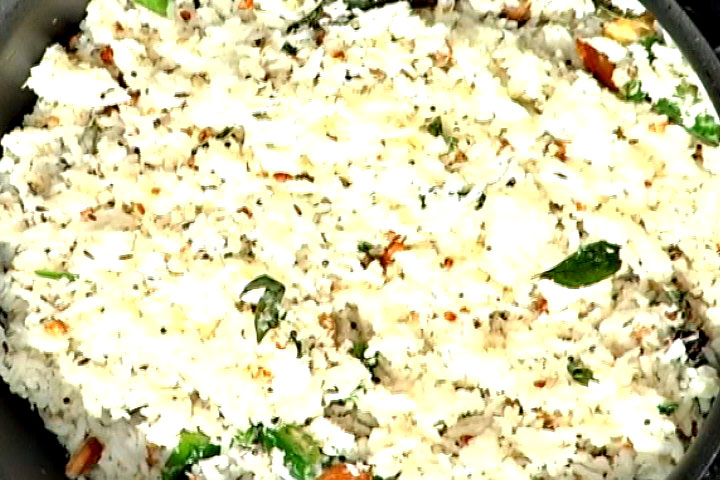 | cook rice seperately make sure it is fulffy Heat ghee in a pan.Add cumin,mustard ,red chilli whole and saute till the aroma is released. Now add the channnadal,urad dal ,gr chillies,ginger curry leaves cashew nuts, and saute till soft.Then add the coconut grated and sugar.Gently stir Then add the rice and fry for 2-3 minutes .chech seasoning .Stir well and adjust .Serve hot. |